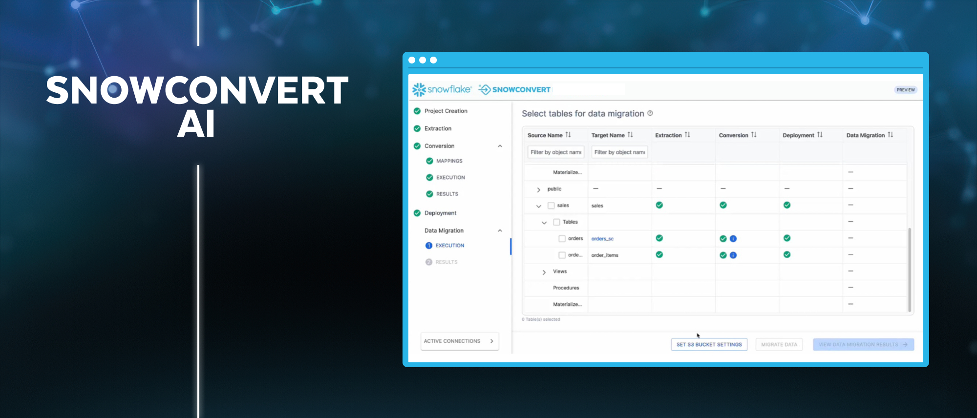 With SnowConvert AI, Snowflake is making one of the most tedious and time-consuming parts of digital transformation — data warehouse migrations, business intelligence (BI) migrations, and ETL migrations — faster and smarter, without introducing additional risk factors. With data ecosystem migration agents powered by Snowflake Cortex AI, SnowConvert AI enables organizations to quickly and easily move from legacy data warehouses like Oracle, Teradata, Google BigQuery, and other cloud data platforms to Snowflake.