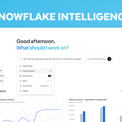 - Multi-step reasoning with deep research: With deep research (public preview soon), Snowflake Intelligence helps users answer their most complex questions with fully cited, multi-step reports. It uses an agentic architecture to reason across structured data, unstructured content, and external context, complementing extended thinking’s precise answers with deeper analysis so users can understand not just what’s happening, but why and what to do next.